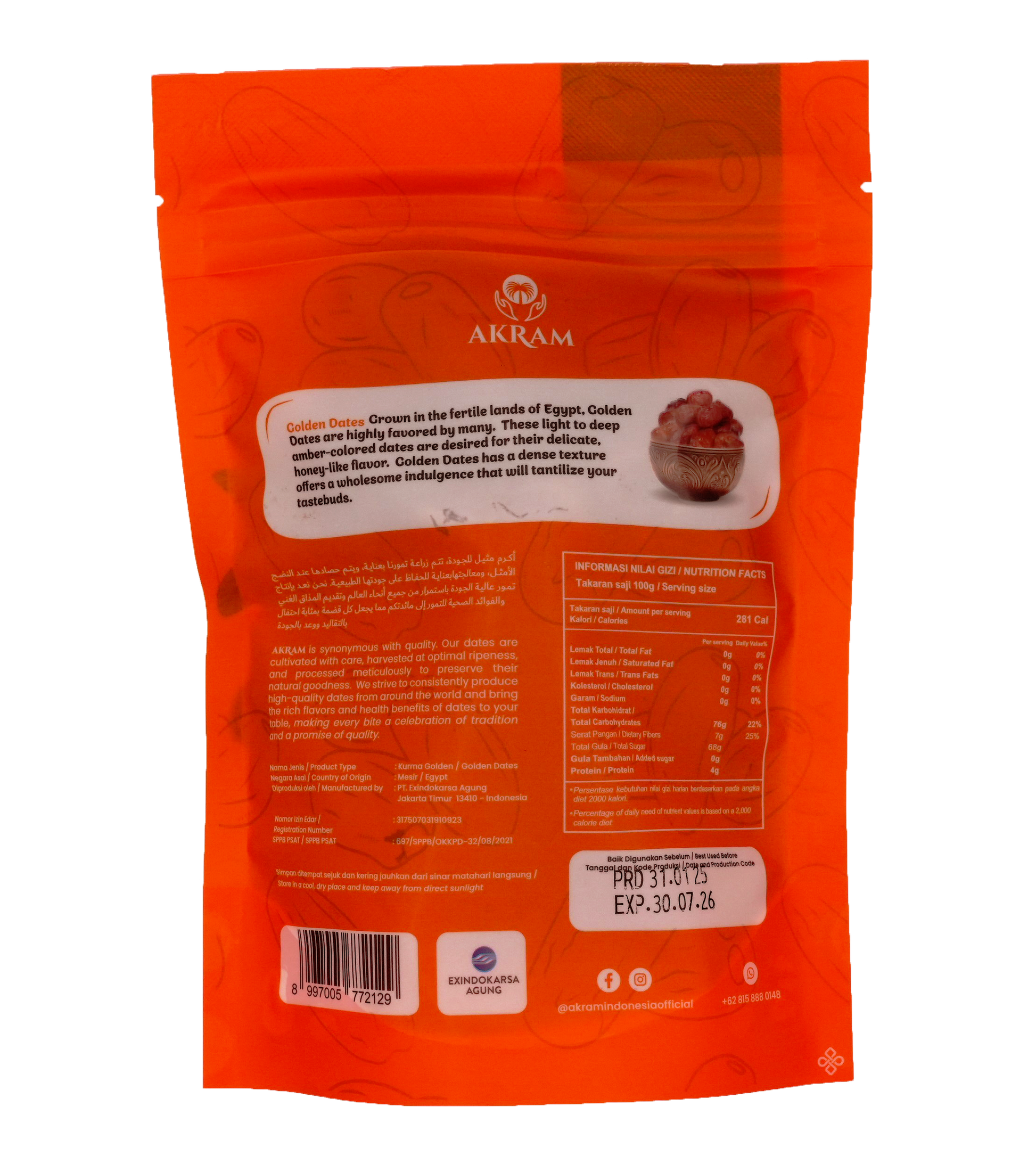 Akram Golden Dates 200g delivers a honey-like flavour and dense texture, handpicked from Egypt’s fertile lands. These vegan, Halal-certified dates are rich in fibre, antioxidants, and minerals, supporting digestive health and energy. Ideal for daily snacking, gifting, or as a natural sweetener.