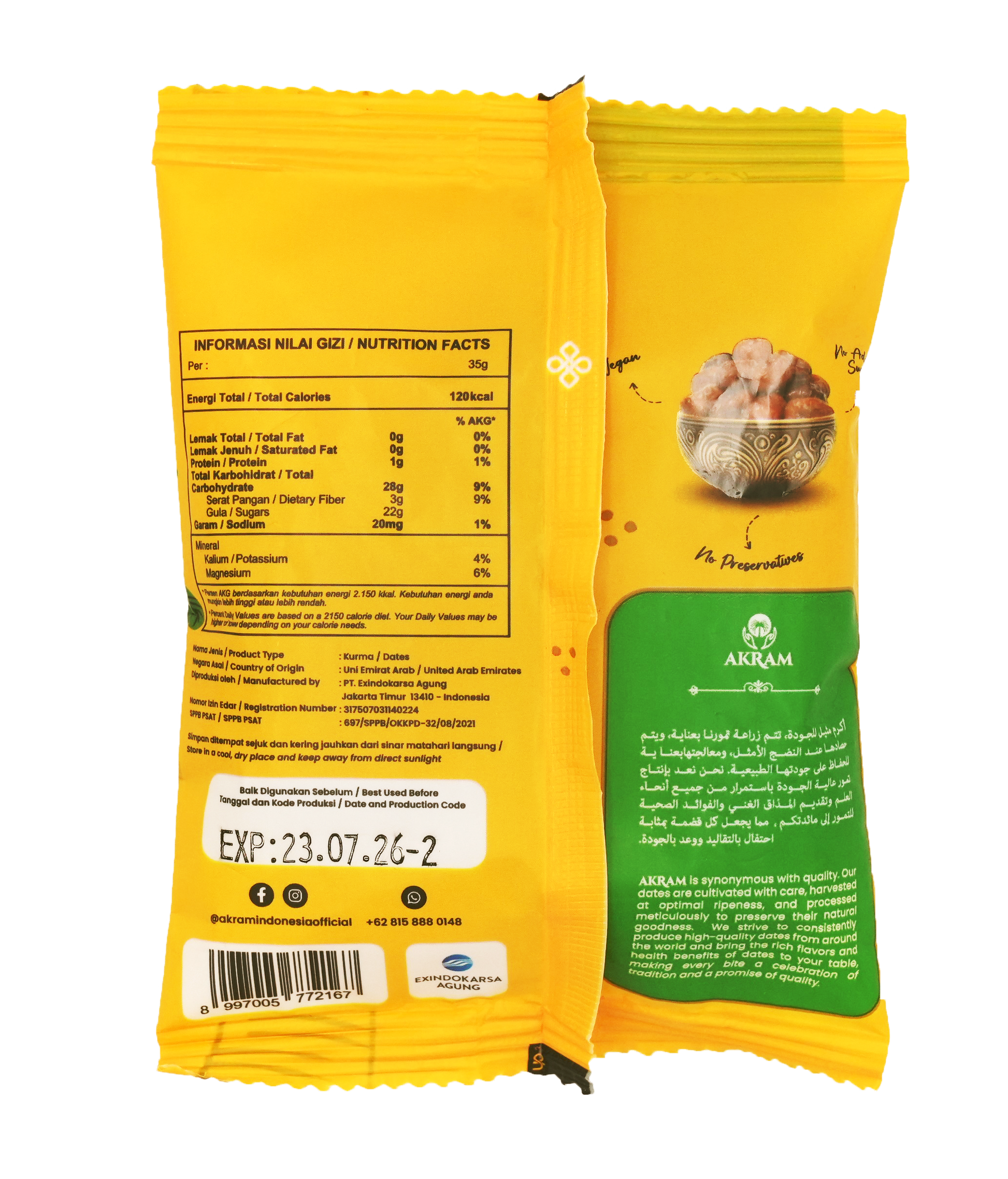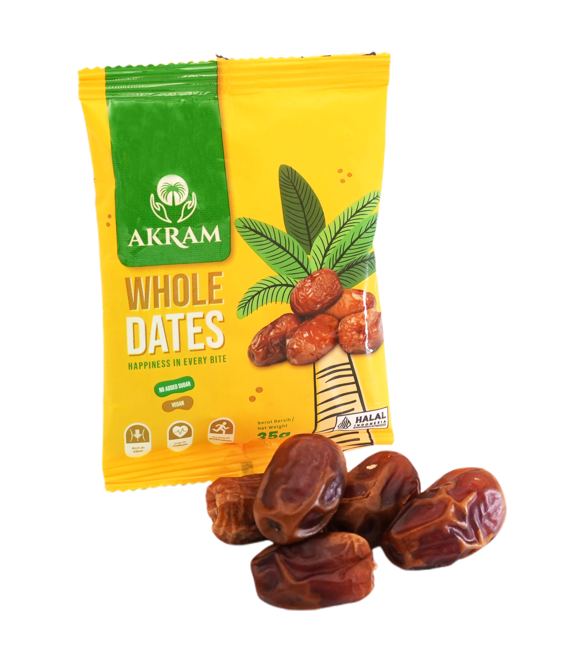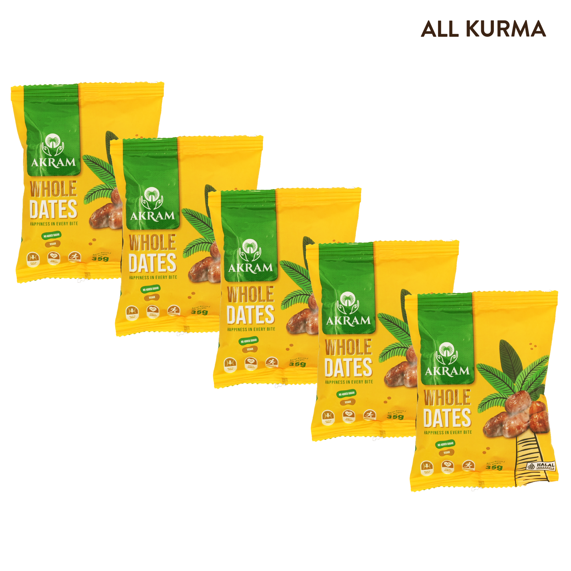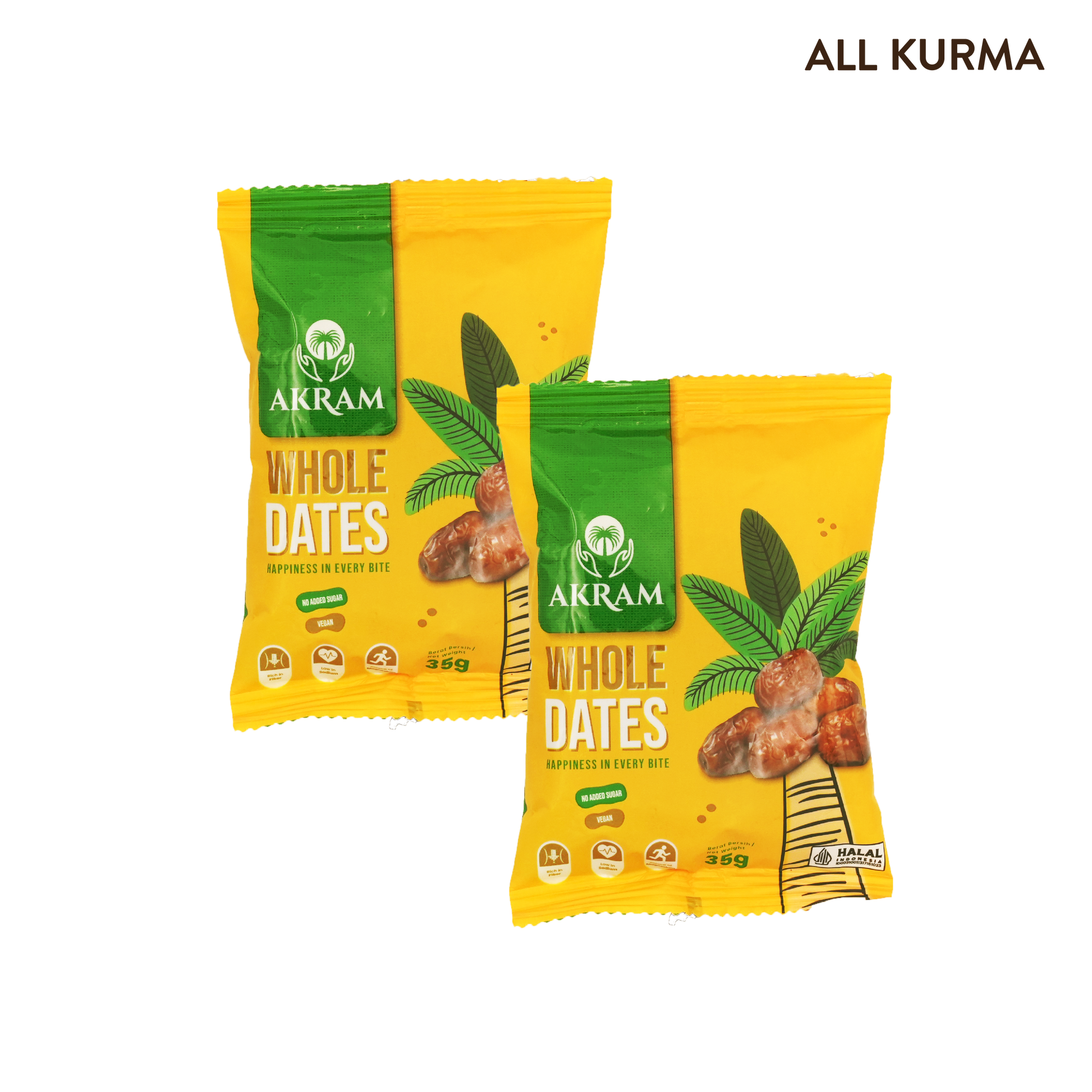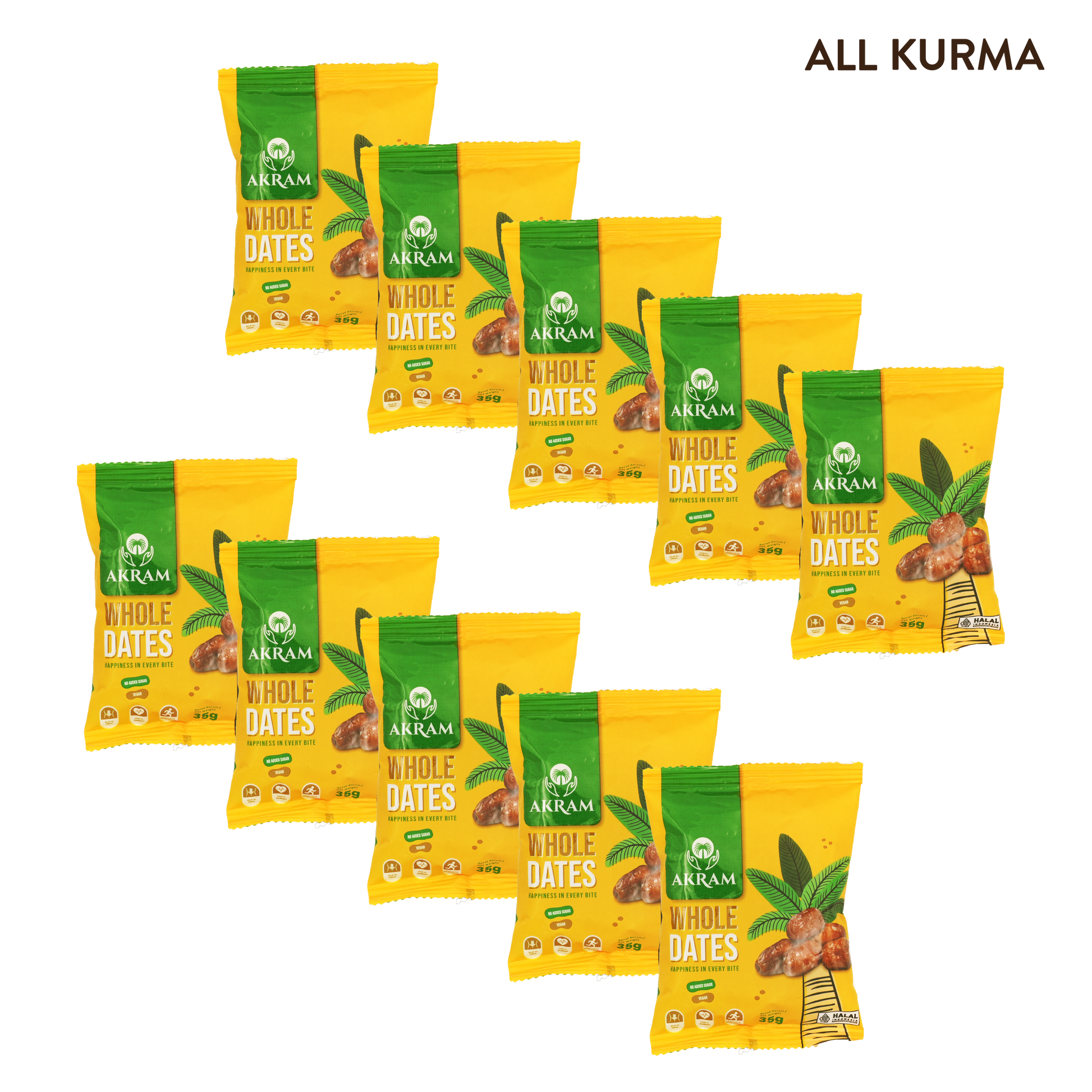 Fuel your day with the Akram Whole Dates Snack Pack – now available in a convenient pack of 10 (10 x 35g). Grown in the sun-soaked farms of the United Arab Emirates, these 100% natural whole dates are free from added sugar, preservatives, and artificial ingredients.